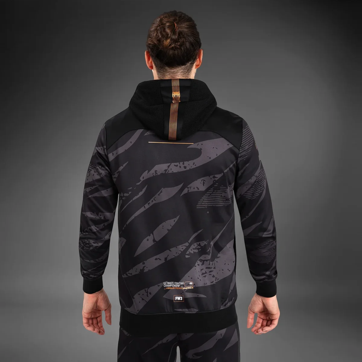 Son imprimé camouflage audacieux, orné des logos Venum et UFC en bronze, est inspiré par les athlètes qui montent dans l’Octogone, prêts à attaquer et à riposter.